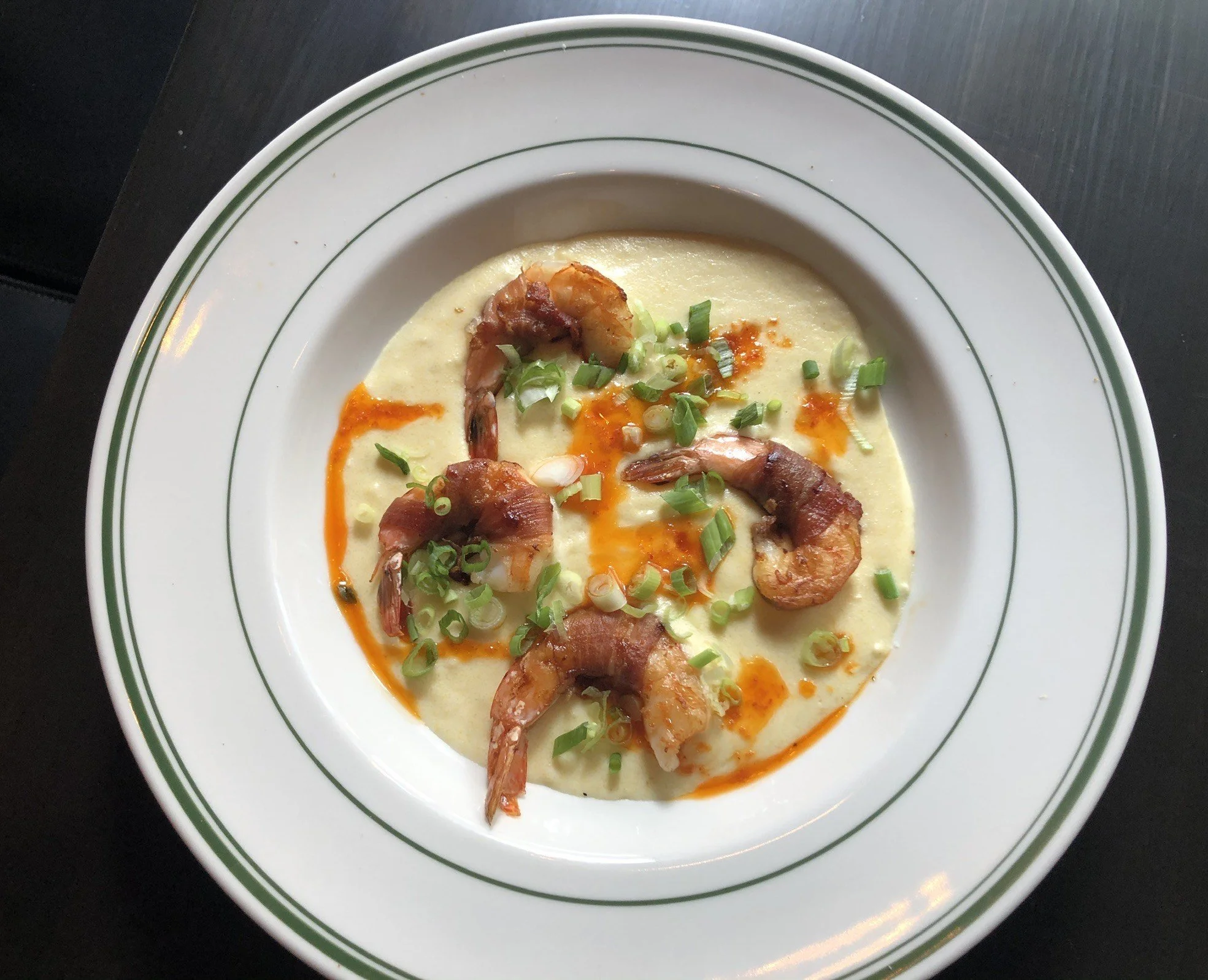 Grilled proscuitto wrapped, pesto shrimp, roasted garlic/parmesan polenta, Calabrian chili oil